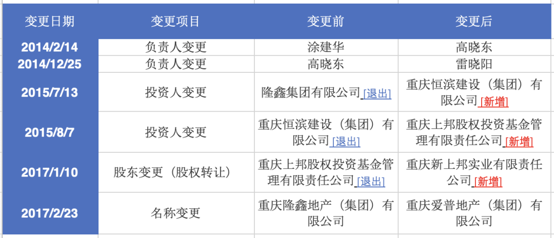 2014年2月,隆鑫地产的法定代表人悄然由涂建华变更为高晓东;此后,隆鑫地产的投资人也经过3次变更,最终归到新上邦实业名下。而在2017年2月,隆鑫地产的名称也变更为了爱普地产。