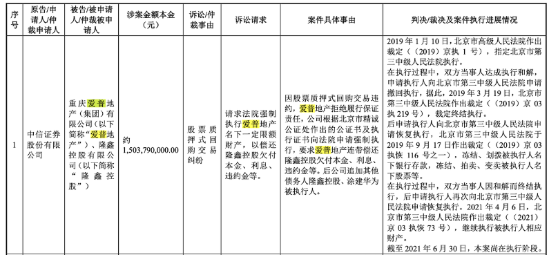 2019年8月,重庆建工因建筑工程施工合同纠纷,起诉爱普地产等3家单位,涉案金额9666万元;而中信证券也自2018年12月起,多次申请强制执行爱普地产资产,金额超15亿元。