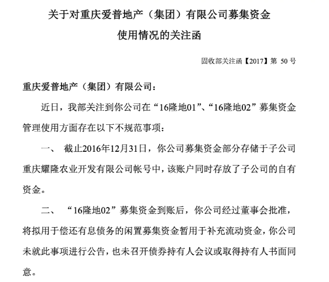 据深交所2017年5月关注函显示,爱普地产将募集到的资金,部分存储于子公司“耀隆农业”的帐号中,而该账户同时存放了子公司的自有资金。同时,“16隆地02”募集资金到账后,在未公告、未召开持有人会议、也未取得持有人书面同意的情况下,爱普地产董事会就将拟用于偿还债务的资金挪去补充了流动性。