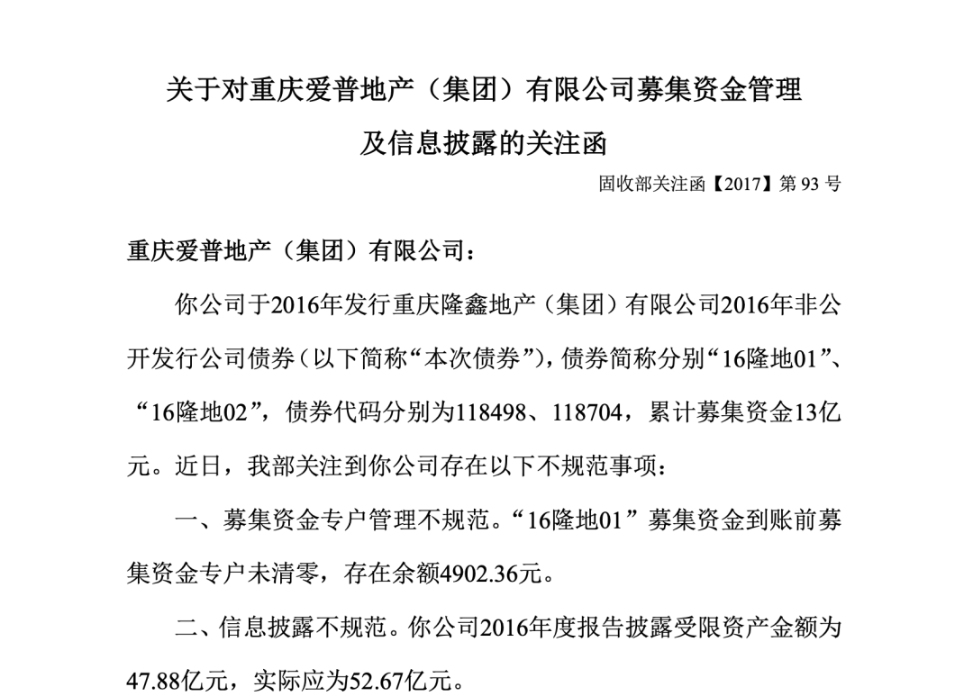 奇葩操作还没完。5个月后,爱普地产再收关注函:募集资金专户管理不规范——“16隆地01”资金到账前,资金专户未清零,尚存余额4000多元。而且,爱普地产在2016年年报中披露的“受限资产金额为47.88亿元”,实际应为52.67亿元。
