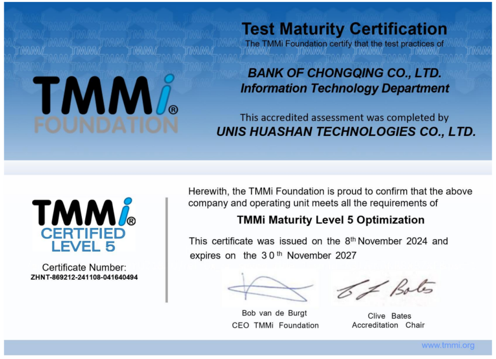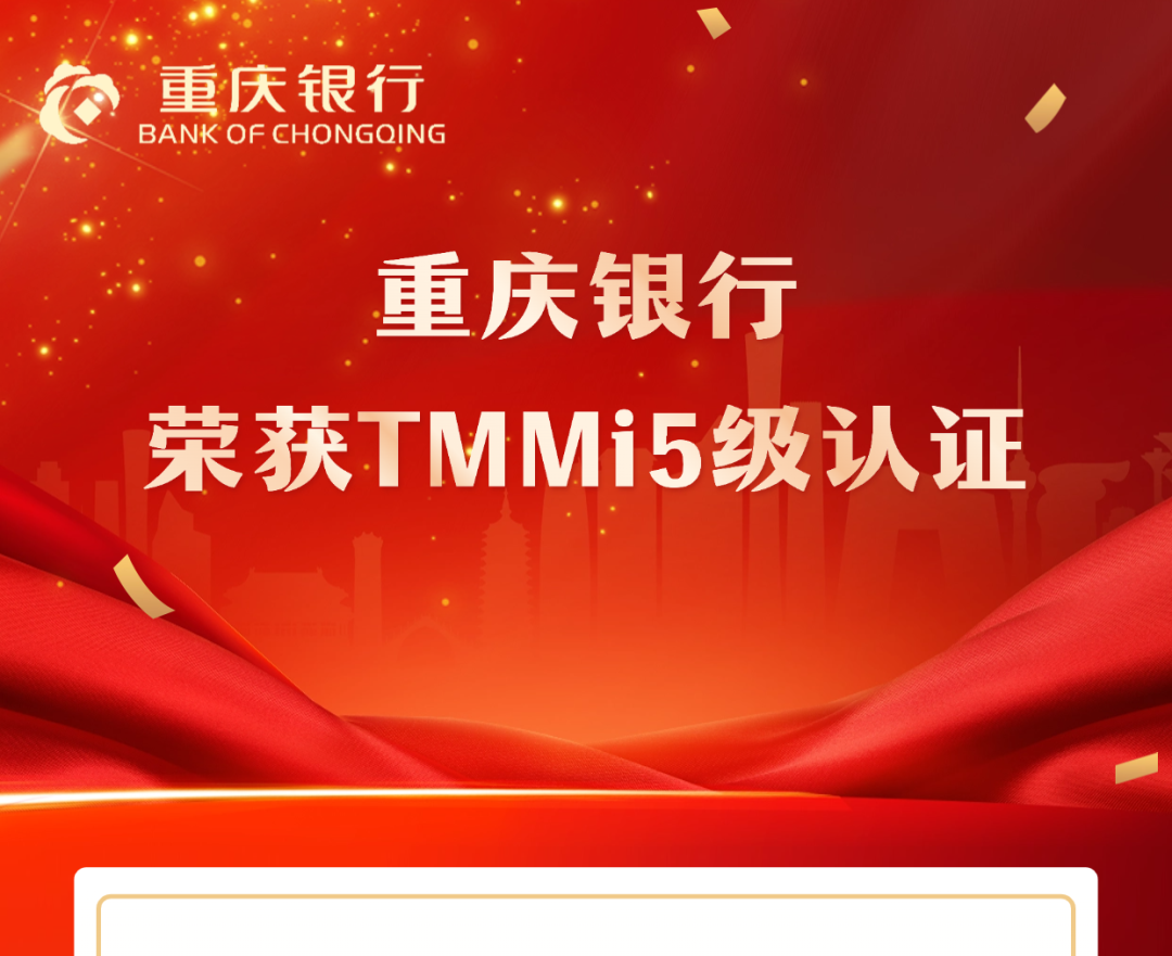 继2022年获得TMMi3级认证后,重庆银行今年再次以“高符合度”的过程域评价结果成功获得了由TMMi基金会颁发的TMMi5级测试能力成熟度认证,成为全国首家获得TMMi5级认证的城商行。此次获得TMMi5级认证标志着重庆银行金融科技的测试与质量管理能力已迈入国内银行业先进行列。