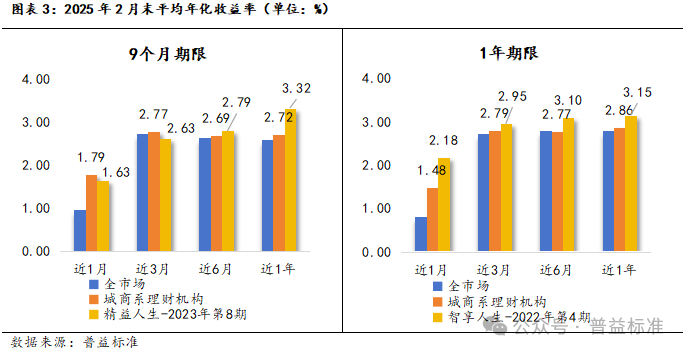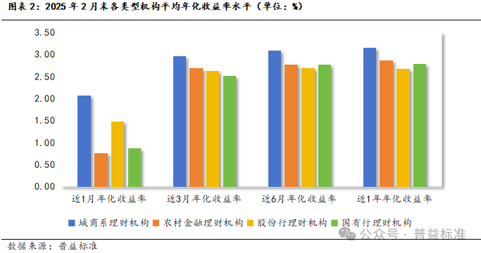 然而,面对收益压力,城商系理财机构[4]依托区域资源禀赋,通过深耕属地优质城投债、企业债等资产实现收益增厚,因此能够在近期债市波动的环境下展现出更强的收益获取能力。数据显示,截至2025年2月末,城商系理财机构各回溯区间的收益表现均优于其他类型机构,以近3月年化收益率为例,其以2.96%居于首位。