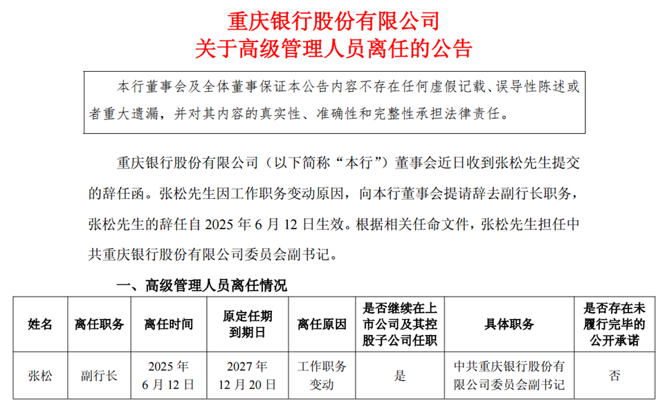 6月14日,重庆银行(601963.SH)发布公告称,原副行长张松提交辞任函,宣布因工作职务变动原因,辞去副行长职务。