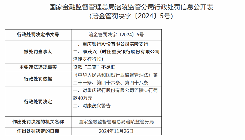 而违规行为不仅在总行发生,其分支机构也接连收到多张罚单:2024年10月,毕节分行由于在贷款过程中附加不合理条件,通过第三方中介吸存被罚30万元,相关责任人被警告;11月,涪陵支行、丰都支行因贷款“三查”不到位被罚70万元,大足支行因贷款资金被挪用被罚30万元。