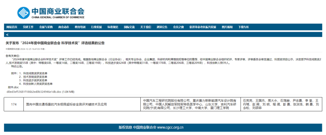 12月25日,2024年度中国商业联合会科学技术奖评审结果公布,由中国汽研牵头申报的“面向中国交通场景的汽车极限超标安全测评关键技术及应用”项目荣获科技进步一等奖。