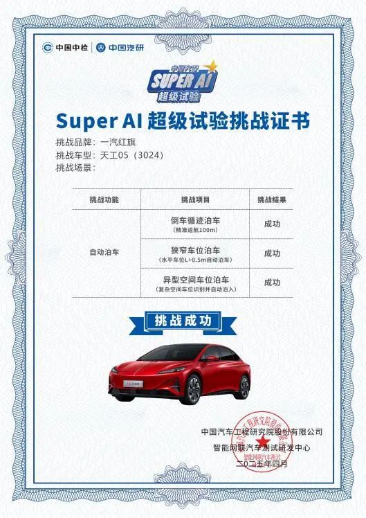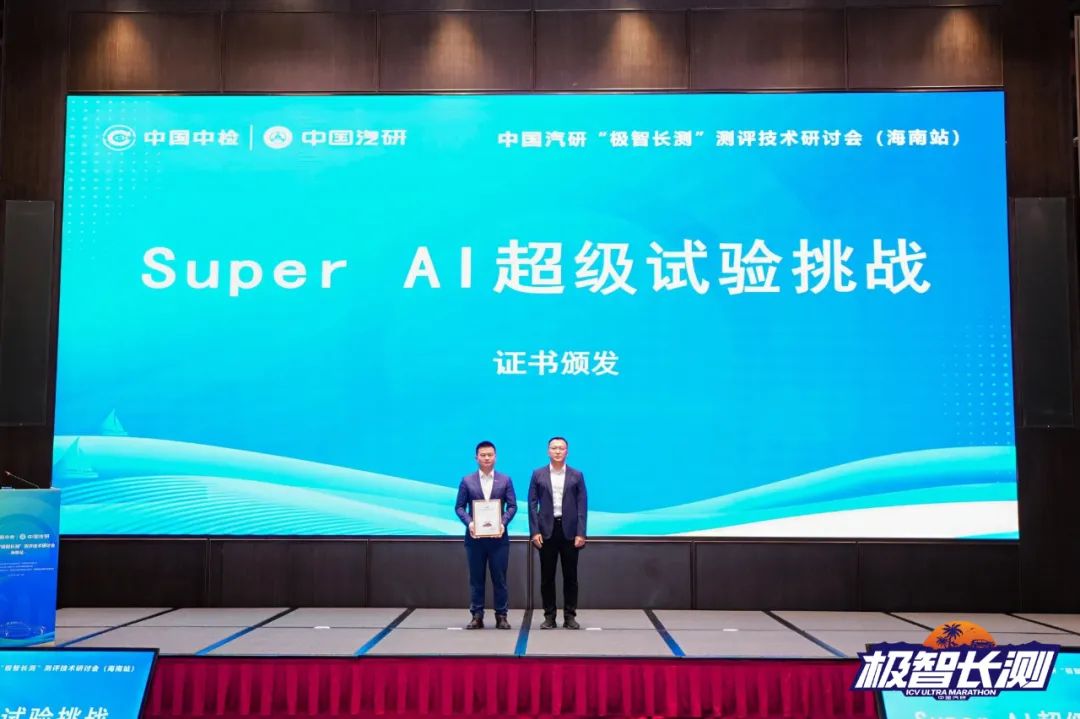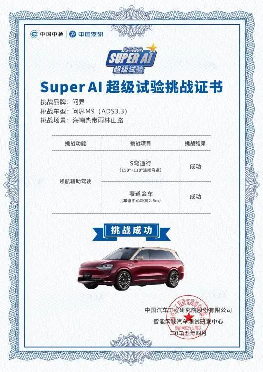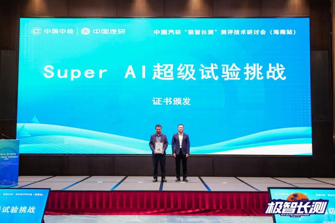 会上颁发了Super AI超级试验最新挑战证书,赛力斯问界M9车型通过“领航辅助驾驶-海南热带雨林山路”挑战,一汽红旗天工05车型通过“自动泊车”挑战。