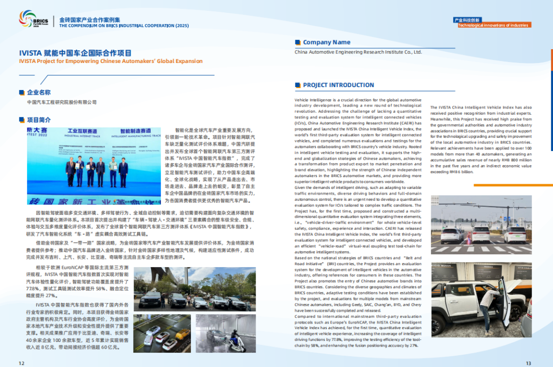 为学习贯彻习近平总书记在金砖国家领导人第十六次会晤和“金砖+”领导人对话会上的重要讲话精神,推动创新金砖、绿色金砖建设,促进“大金砖合作”高质量发展,工业和信息化部办公厅组织开展了金砖国家产业合作案例征集工作,共评选出37个2025金砖国家产业合作案例并于9月16日在 2025 金砖国家新工业革命伙伴关系论坛上正式发布。中国汽研牵头报送的《IVISTA赋能中国车企出海:“测评新基建”共筑汽车产业协同发展新生态》入选。