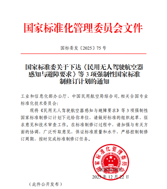 近日,国家标准化管理委员会正式下达《民用无人驾驶航空器感知与避障要求》《民用无人驾驶航空器飞行控制系统数据记录要求》《民用无人驾驶航空器数据链路网络安全要求》三项强制性国家标准制修订计划(国标委发〔2025〕75号),标志着我国民用无人机标准化建设进入新阶段。中国汽研凯瑞机器人公司作为核心编制单位,深度参与该系列国家标准制定工作。