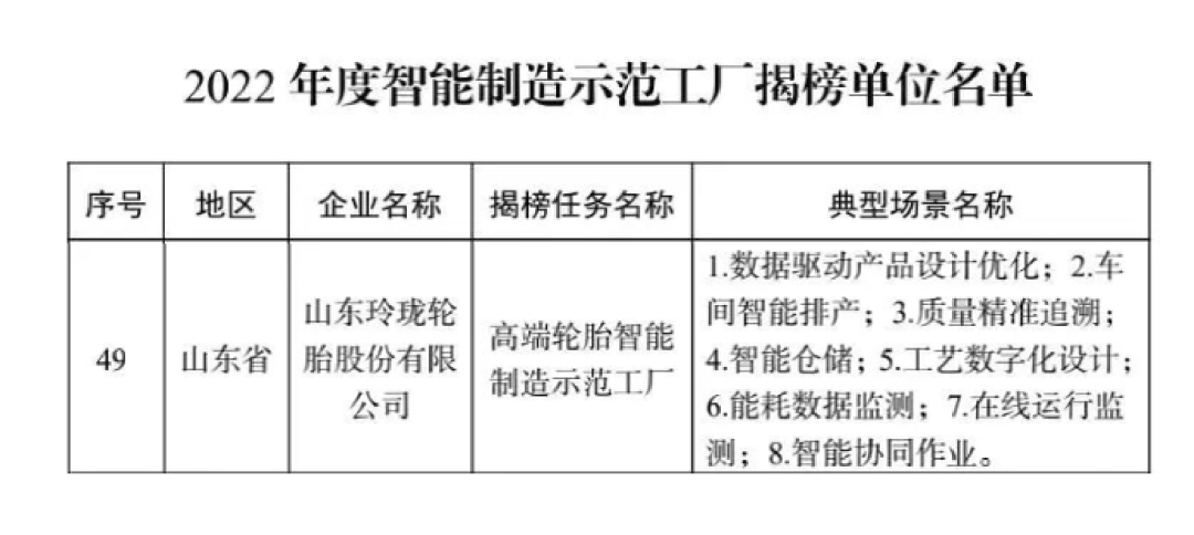 近日,工业和信息化部等四部门联合公布2022年度智能制造示范工厂揭榜单位名单,经省级有关部门推荐、专家评审、网上公示等程序,玲珑高端轮胎智能制造示范工厂成功上榜名单。