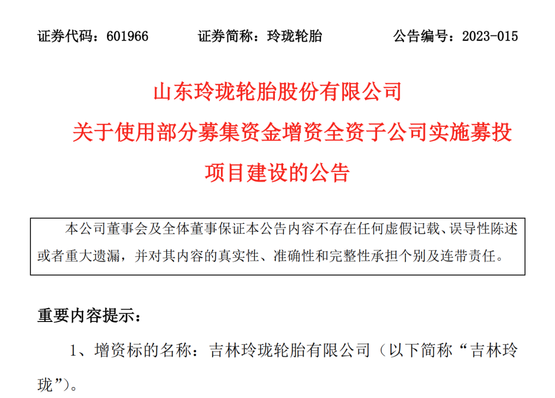 近日,山东玲珑轮胎股份有限公司发布《关于使用部分募集资金增资全资子公司实施募投项目建设》的公告。