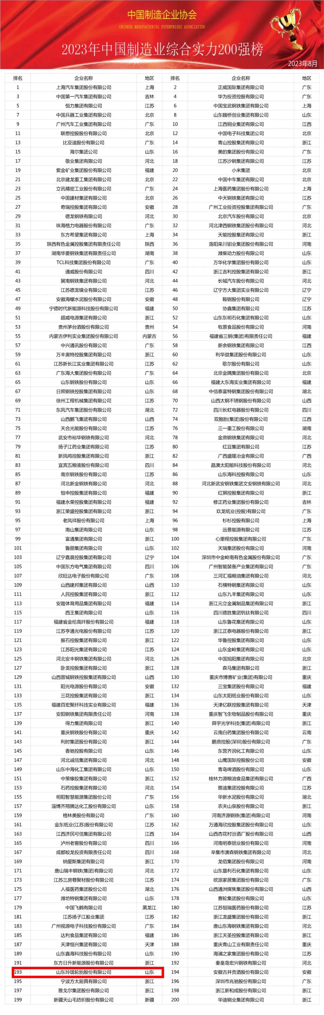 据悉,排行榜是中国制造企业协会对我国制造业企业进行全面、科学、独立的企业实力发展调查研究宣传发布工作。通过对超过8000家利润总额在5000万元至500亿元之间的中国大陆制造型企业进行了数据采集研究,基于对财务分析、行业分析、市场占有率分析确定候选企业,邀请100位企业高管、学者及官员对经资格审核符合要求的企业进行评选,比照国际上通行的做法,根据营业收入、资产总额、利润总额、所有者权益、研发投入、从业人数等指标对候选企业进行综合评分排出,并对部分候选企业进行实地拜访,从中遴选出200家《中国制造业综合实力200强》企业及100家《中国装备制造业100强》企业。