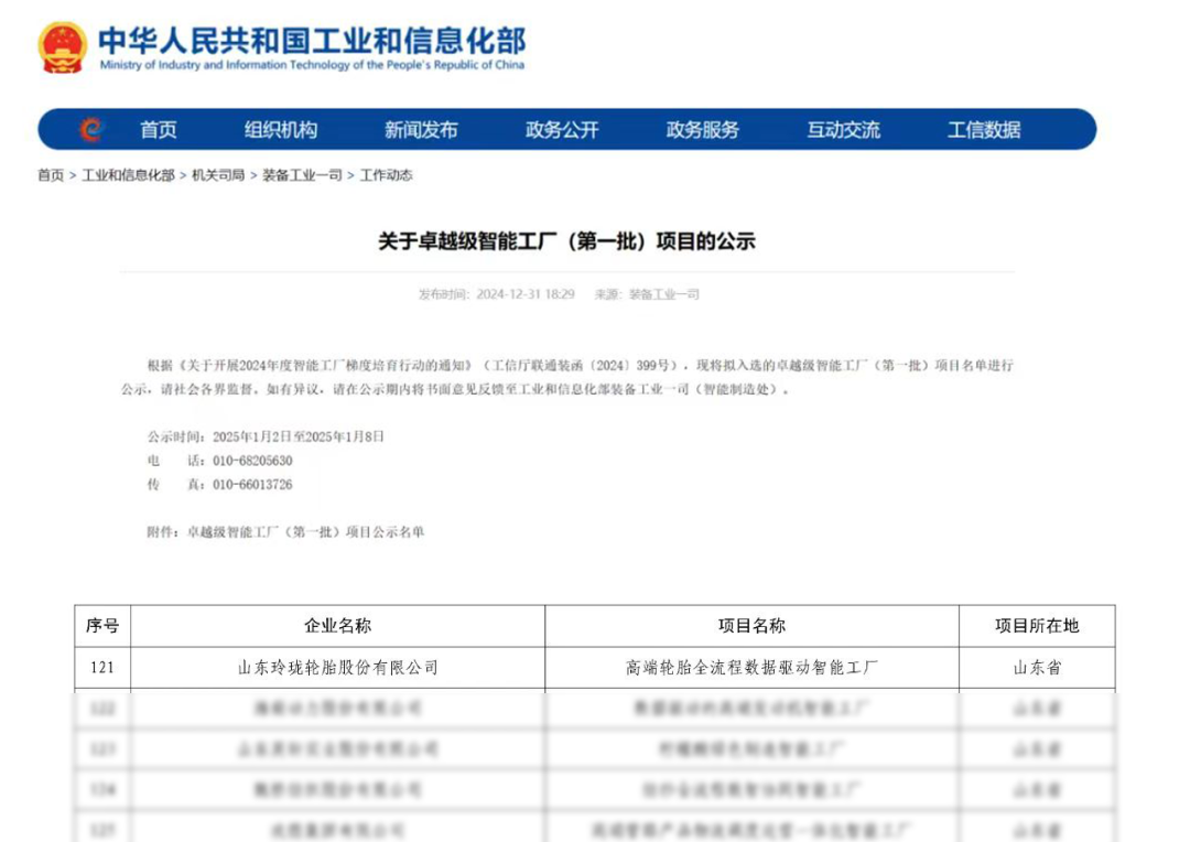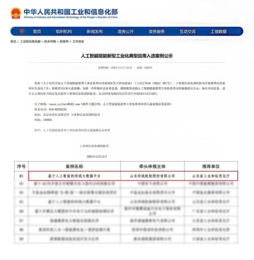 近期,玲珑轮胎数智化工厂再次入围工信部两项重要榜单,其中,“基于人工智能的玲珑大数据平台”入围工信部人工智能赋能新型工业化典型应用案例名单;“高端轮胎全流程数据驱动智能工厂”入围工信部卓越级智能工厂(第一批)项目名单。