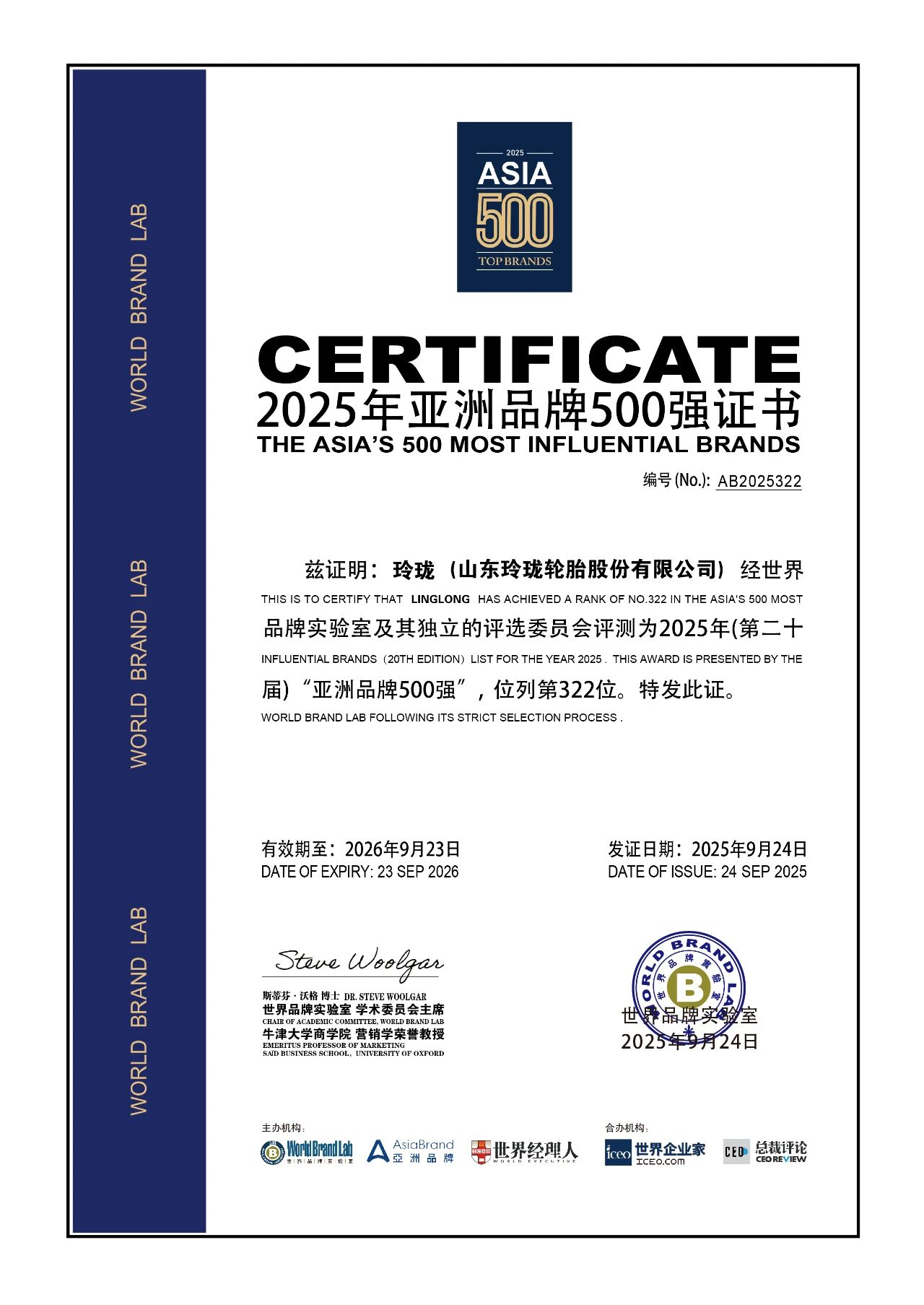 亚洲品牌大会于9月24日在香港召开。主办方世界品牌实验室(World Brand Lab)在会上发布了2025年(第二十届)《亚洲品牌500强》年度报告,玲珑轮胎凭借其持续深化的品牌影响力与创新实力再度荣誉登榜,实现自2014年以来连续第十二年稳居该榜单,彰显了其穿越周期、持续增长的卓越品牌韧性。