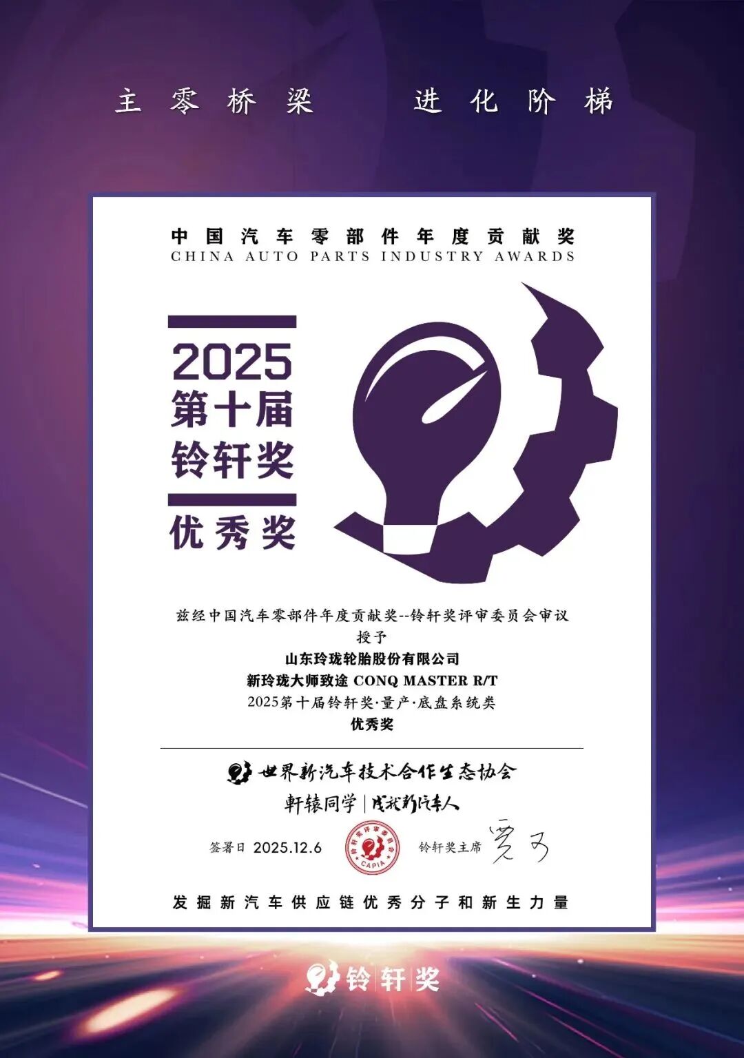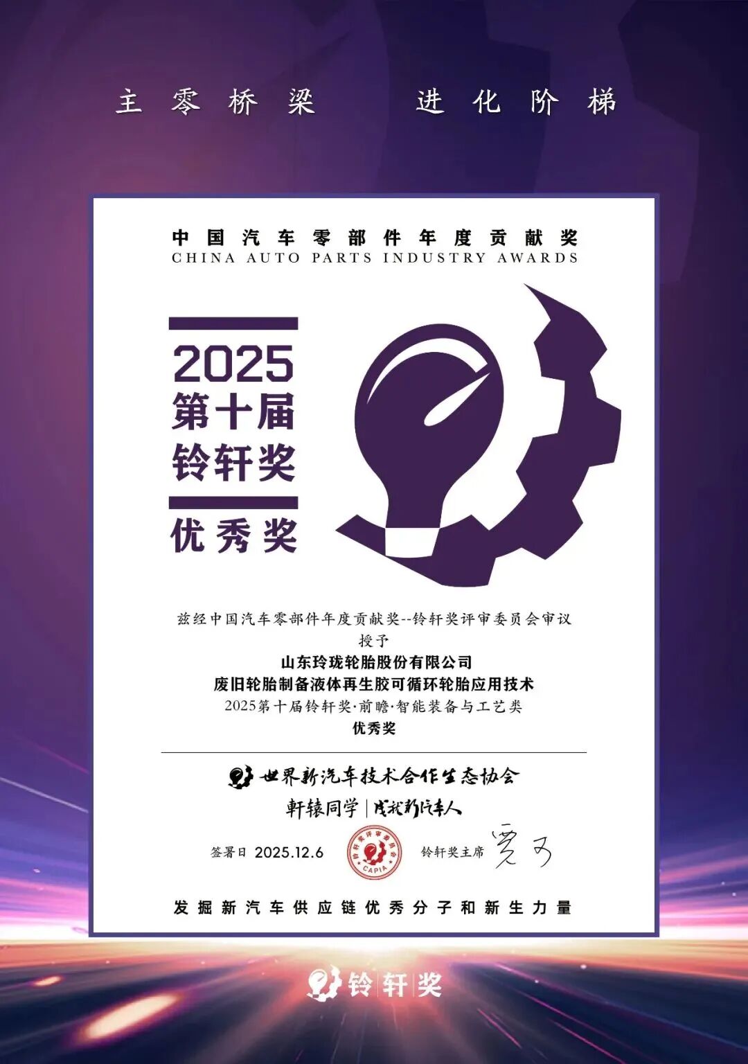 12月6日,第十届铃轩奖颁奖典礼在苏州揭晓。在为期半年、经过29位专家严格评审的激烈角逐中, 玲珑轮胎 从百余项申报中脱颖而出,斩获双项大奖:“废旧轮胎制备液体再生胶可循环轮胎应用技术”荣膺前瞻类优秀奖,“新玲珑大师致途”夺得量产类优秀奖。玲珑第六次成为该汽车零部件权威奖项唯一获奖轮胎企业,彰显了其持续领先的创新能力。