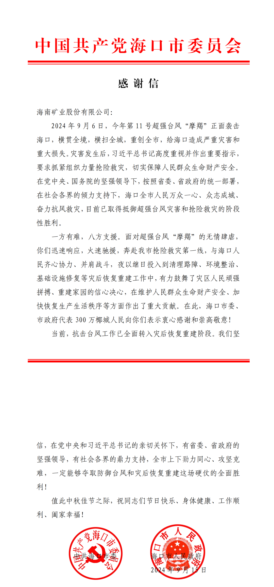 9月,海南矿业先后收到海口市委、市政府以及儋州市科学技术和工业信息化局发来的感谢信,信中对海南矿业迅速响应、火速驰援抢险救灾一线,在维护人民群众生命财产安全、加快恢复生产生活秩序等方面作出的重大贡献表示感谢。