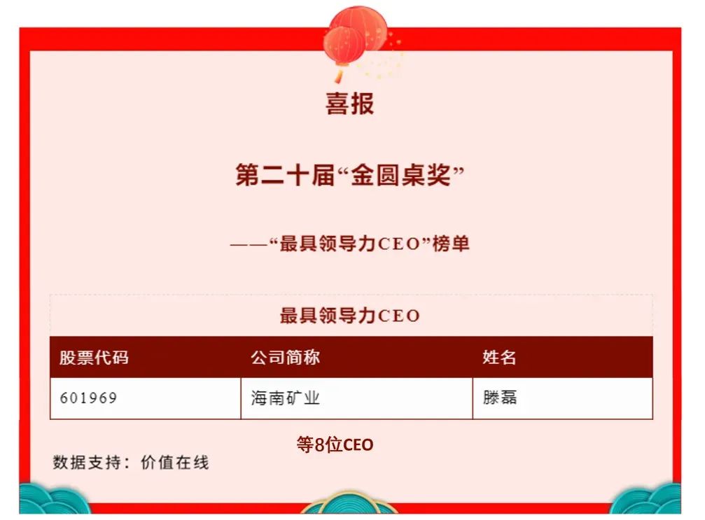近日,第二十届中国上市公司董事会“金圆桌奖”评选结果揭晓,海南矿业总裁滕磊先生获“最具领导力CEO”殊荣。