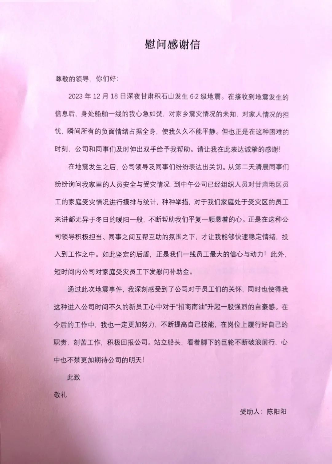 甘肃省武山县船员陈阳阳在信中表示:感谢公司在地震发生之后,及时通过信息摸排调查员工受灾程度,使我深刻感受到公司对员工的关怀,同时也进一步增强了我们一线船员对公司的归属感。今后,我一定在工作岗位上履行好自己的职责,刻苦工作,为公司发展贡献自身力量。