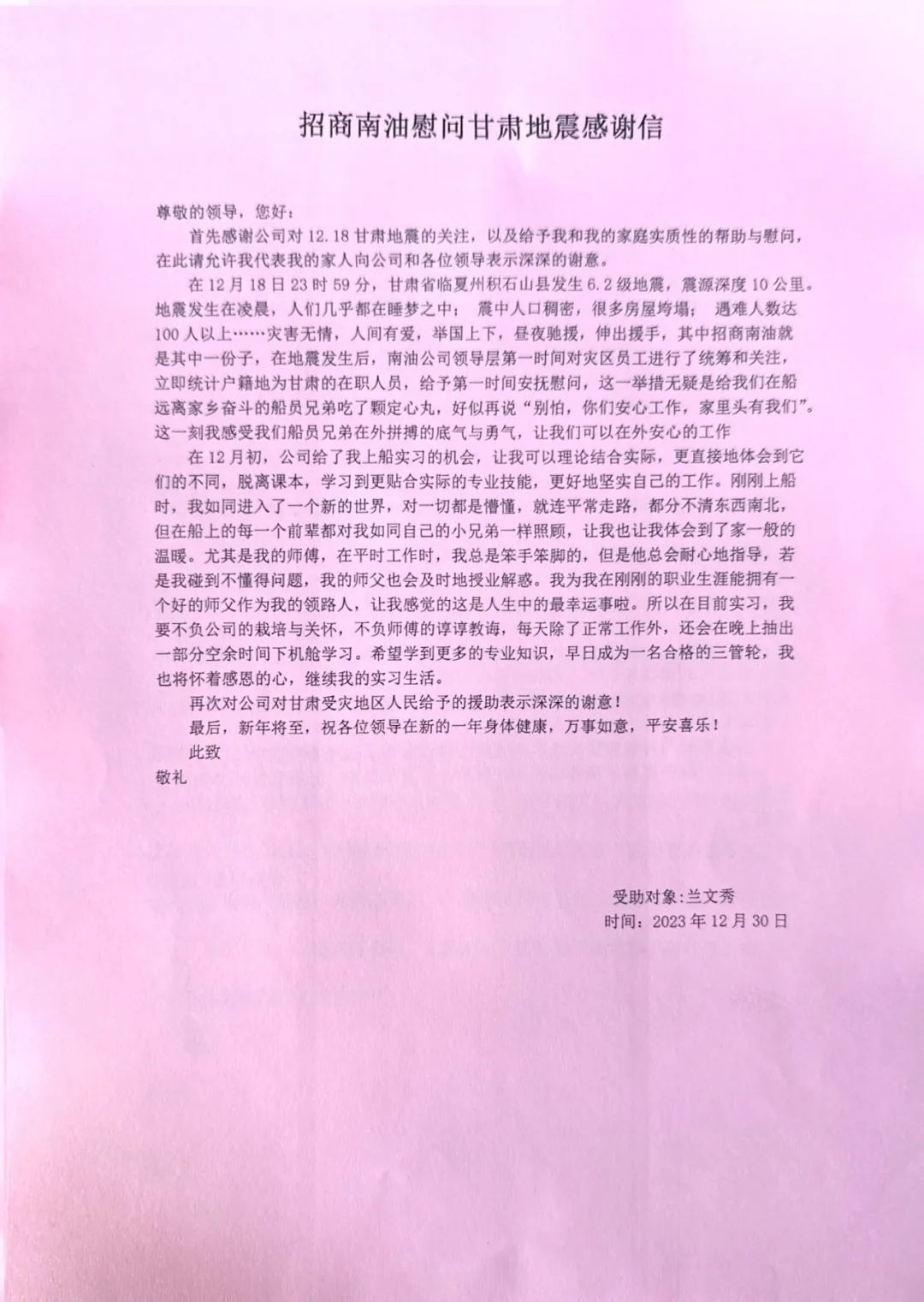 日前,招商南油收到3名甘肃地震受灾船员的感谢信。信中,3名船员对公司第一时间给予关心和慰问致以深深谢意,并表示将在以后工作岗位上履行好自己的职责,刻苦工作。