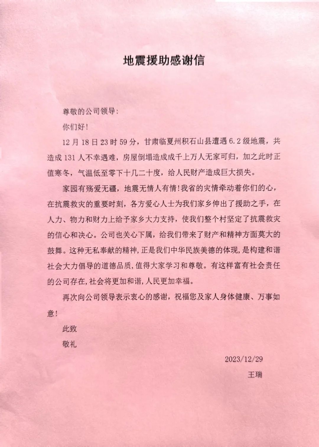 甘肃渭源县船员兰文秀在信中表示:首先,感谢公司对12.18甘肃地震的关注,并给予实质性的帮助与慰问,在此请允许我向公司表示深深的谢意。灾害无情,人间有爱。地震发生后,公司第一时间关心了解灾区员工情况,第一时间给予安抚慰问,这一举措无疑是给我们在船远离家乡奋斗的船员兄弟吃了颗定心丸。这一刻,我感受到了奋斗拼搏的底气与勇气,是源于公司持续不断的关注关爱。