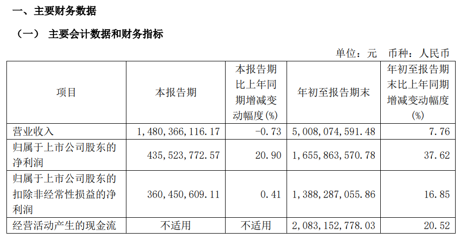 归属于上市公司股东的净利润是本季度业绩表现的亮点之一。第三季度净利润为4.36亿元,同比增长20.9%,前三季度净利润累计为16.56亿元,同比增长37.62%。扣除非经常性损益后的净利润表现同样亮眼,第三季度达到3.6亿元,基本持平于去年同期,前三季度累计为13.88亿元,同比增长16.85%。