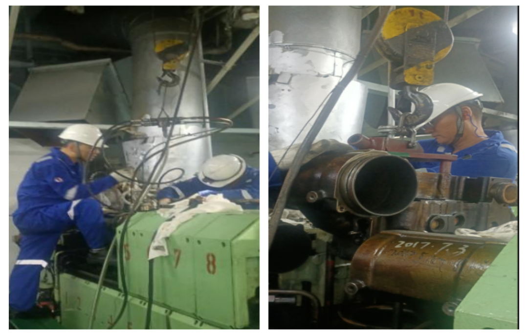 抢修过程中,轮机部检修人员默契配合,熟练拆解缸头连接部件。在闷热的机舱内,他们精准操作,平稳吊离缸头,仔细检查密封面,安装新密封垫。经过数小时连续奋战,新缸头一次性安装到位,试车运行正常。
