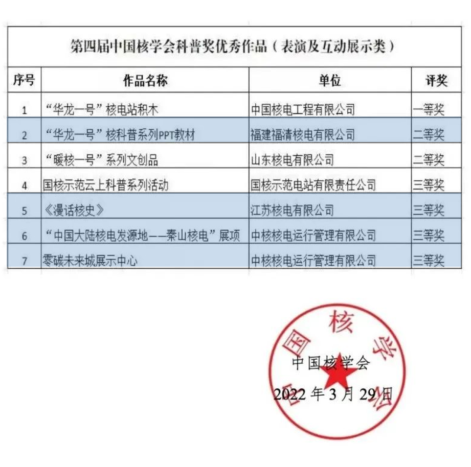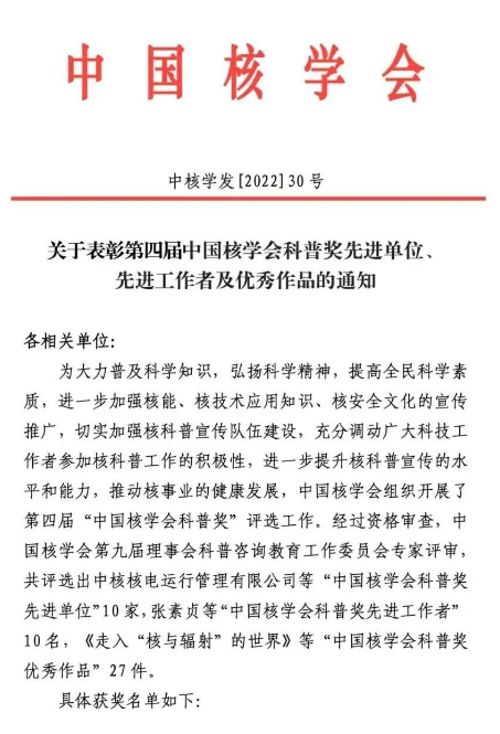 中国核电一批集体个人及作品荣获中国核学会科普奖表彰