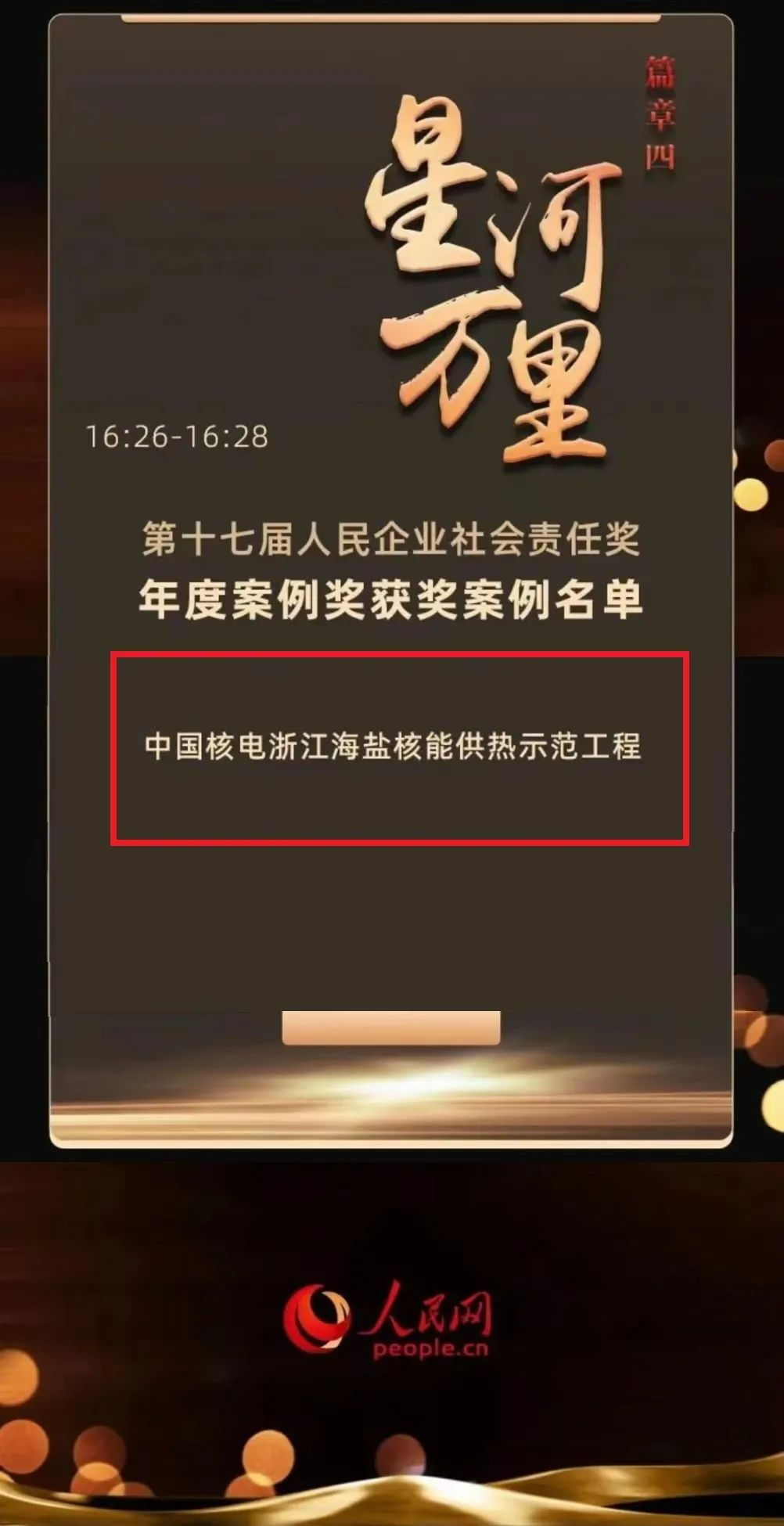 中国核电浙江海盐核能供热示范工程获评“第十七届人民企业社会责任奖”年度案例奖。