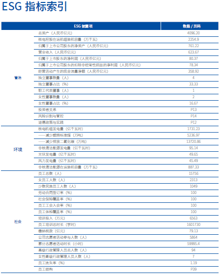 政府、监督机构、交易所等组织要求企业披露环境、社会和管治等非财务信息的范围正在不断扩大。中国核电对标ESG指引,结合行业特性、自身发展状况和利益相关方要求,以管治、环境、社会为分类标准,形成并不断完善ESG指标体系,同时在环境、社会及公司治理报告中连续披露近三年的履责绩效,正面回应利益相关方对ESG绩效指标的信息披露要求,传递公司深入践行可持续发展目标的信念和行动。