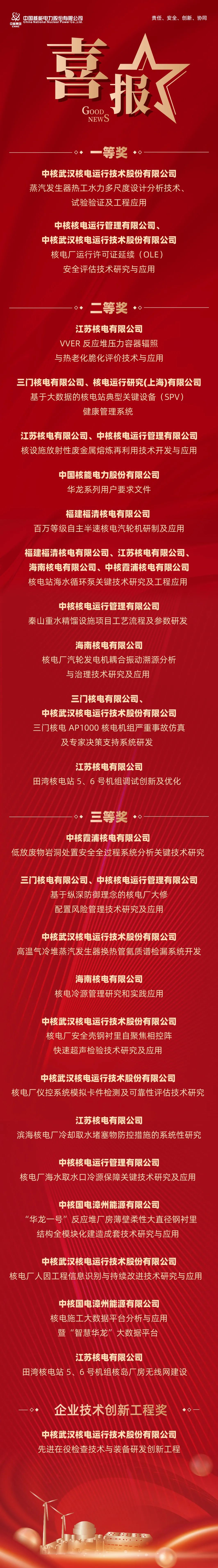 近日,2022年度中国核能行业协会科学技术奖正式揭晓,中国核电荣获25项中国核能行业协会科学技术奖,其中一等奖2项、二等奖10项、三等奖12项,企业技术创新工程奖1项,获奖比例占核能行业协会授奖总量的35%,获奖数量较去年上涨41%,创历年新高。