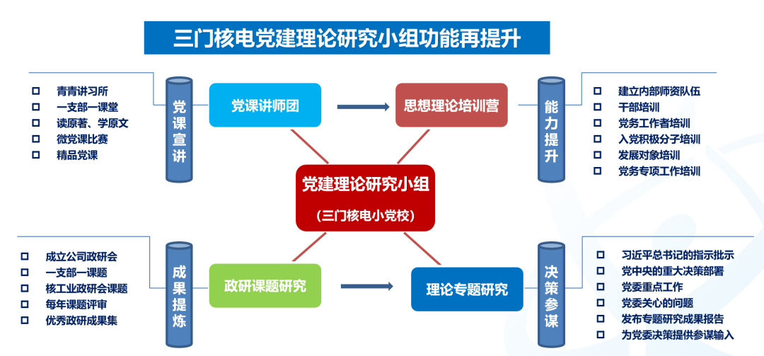 三门核电以党建理论研究小组为主体,以“理论专题研究”“思想理论培训营”“党课讲师团”“思想政治工作研究会”为具体实践平台,打造“1+4”党建理论研究小组品牌,聚焦党建工作重点任务,开展系列党课宣讲、理论课题研究、党务能力提升培训,推进三门核电理论学习研究“小党校”建设,助力党的理论成果充分应用于工作实践。