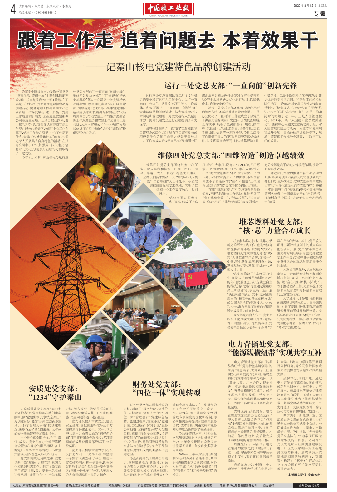 “党建优秀、管理一流”是中国核电基层党建融入中心工作的顶级品牌,瞄准管理提升、安全生产、品牌效应等重要方面,在各级党支部中开展“党建+”活动,通过“党建+安全”“党建+重大工程”“党建+科研”等机制,聚焦主责主业争创一流。
