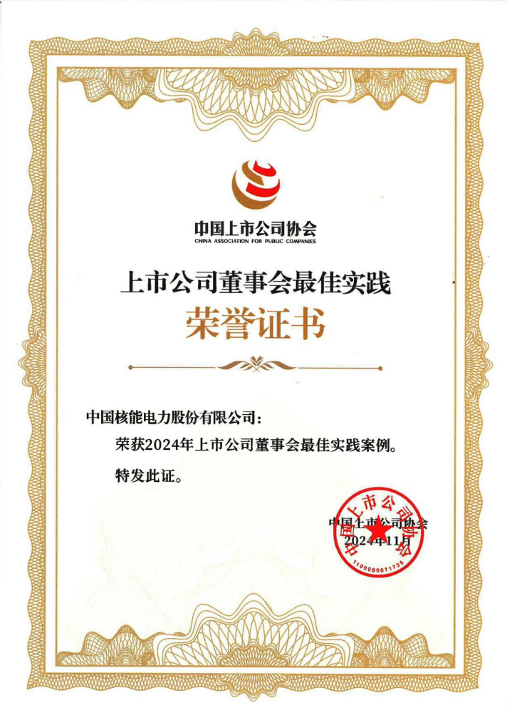 11月22日,中国上市公司协会第三届理事会第五次会议在北京召开,会议以“服务新质生产力,推动高质量发展”为主题,中国核电党委书记、董事长卢铁忠出席会议并作《服务新质生产力,推动高质量发展,谱写中国核电追求卓越新篇章》主旨演讲。会上,公司荣获“中国上市公司2024年董事会最佳实践案例”。