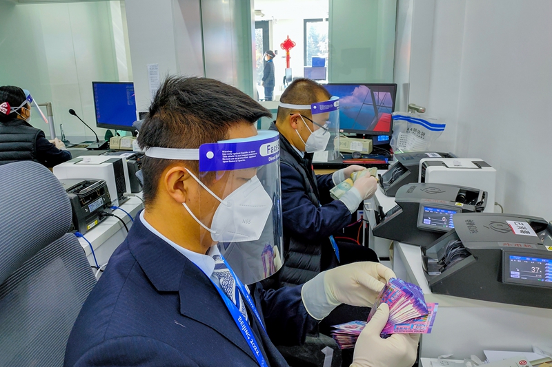北京2022冬奥会各项比赛如火如荼,中国银行作为北京冬奥会和冬残奥会官方合作伙伴,也在全力以赴服务冬奥会,展现金融力量。据悉,本届冬奥会张家口赛区内中国银行设置了赛区指挥中心1个,金融服务区3个,支行2个,并配备了远程支持人员,确保了冬奥会期间金融服务正常运行。图右为中国银行金融服务区的工作人员正在进行营业前外币现金准备工作。