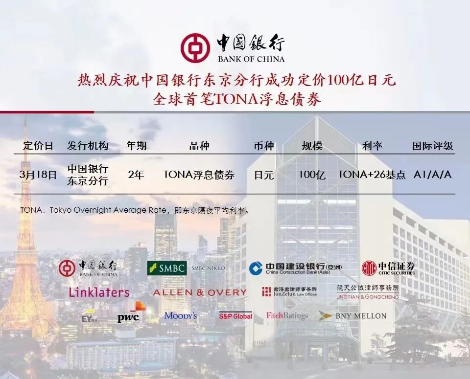 3月18日,中国银行在境外成功完成全球首笔日元新基准TONA浮息债券定价,规模100亿日元。