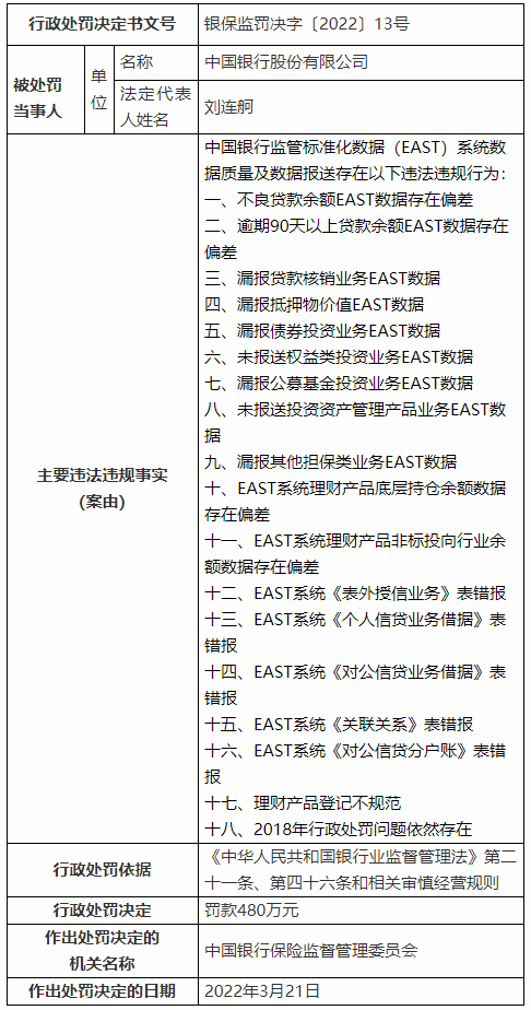 行政处罚信息公开表显示,中国银行监管标准化数据(EAST)系统数据质量及数据报送存在“不良贷款余额EAST数据存在偏差”、“逾期90天以上贷款余额EAST数据存在偏差”、“漏报贷款核销业务EAST数据”等18项违法违规行为。依据《中华人民共和国银行业监督管理法》第二十一条、第四十六条和相关审慎经营规则,罚款480万元。