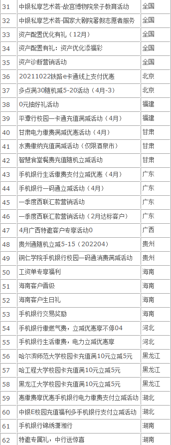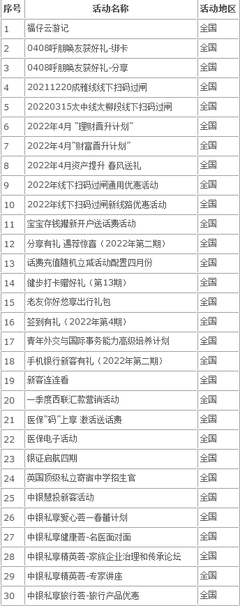 公告称,中国银行将于北京时间2022年4月11日(周一)23:45至4月12日(周二)6:00进行系统升级。系统升级期间,中国银行手机银行、微信银行等各线上渠道的营销活动将暂停服务,具体如下: