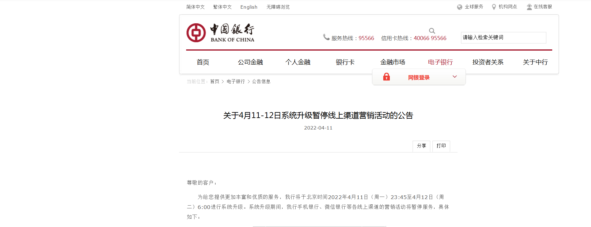4月11日,中国银行官网发布关于4月11-12日系统升级暂停线上渠道营销活动的公告。