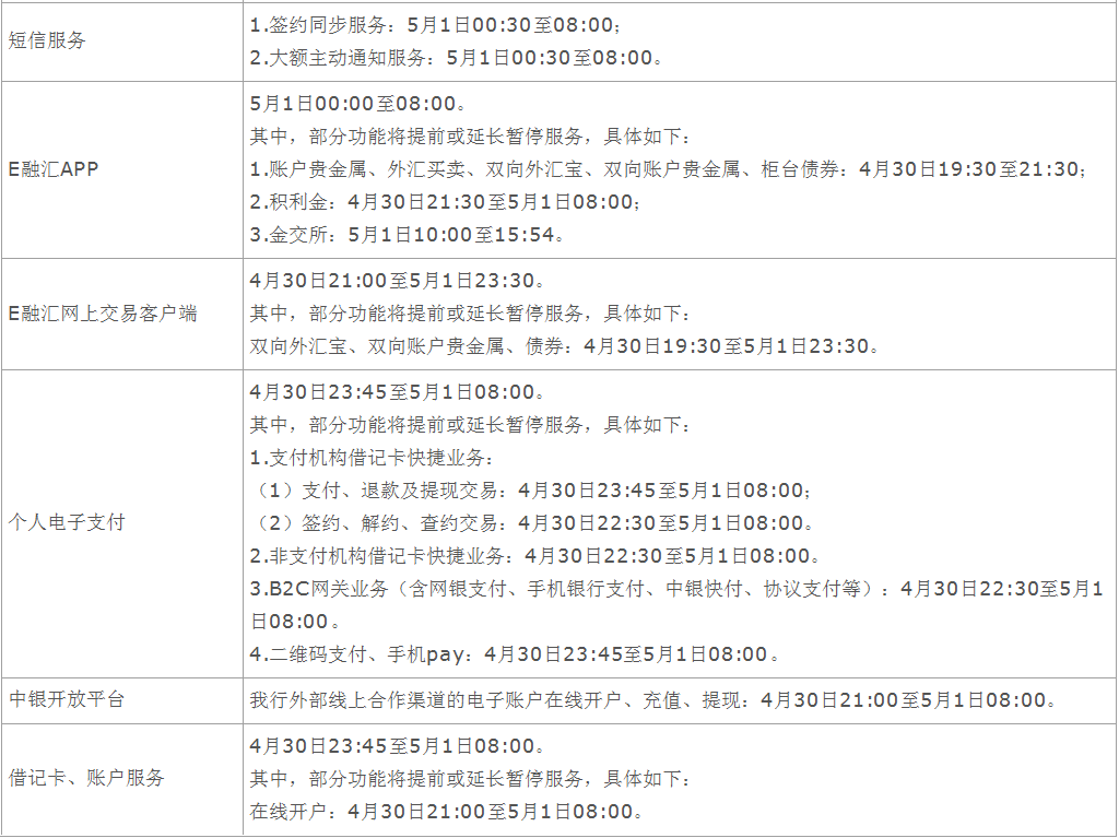 关于4月30日-5月2日系统升级暂停个人电子银行服务的公告