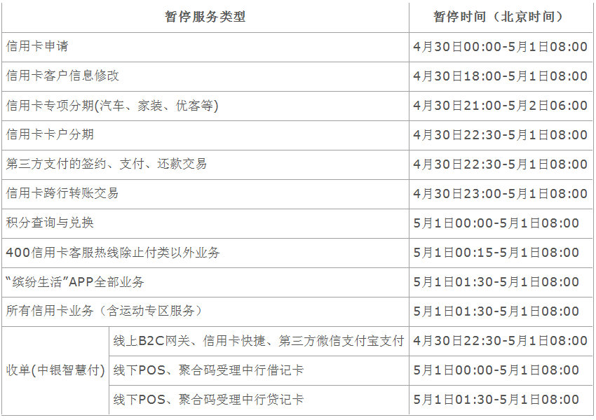 关于4月30日-5月2日系统升级暂停信用卡服务的公告