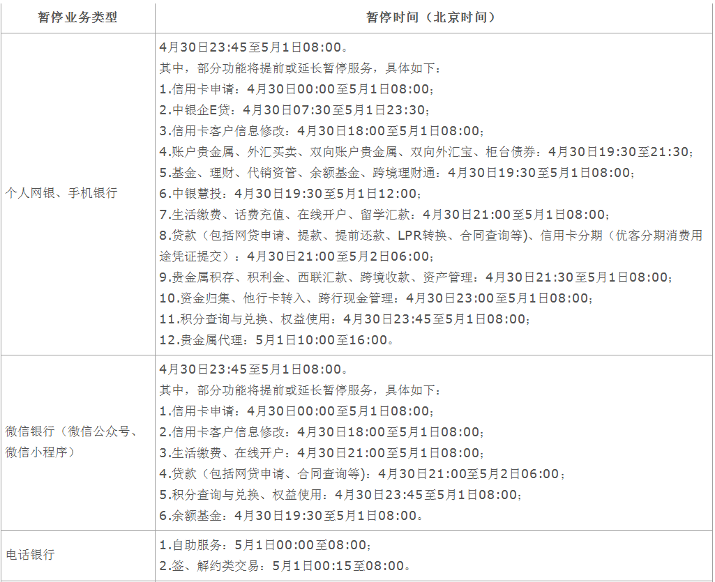 4月26日,中国银行官网发布关于4月30日-5月1日系统升级暂停个人电子银行服务的公告(面向海外客户)、关于4月30日-5月2日系统升级暂停个人电子银行服务的公告、关于4月30日-5月2日系统升级暂停信用卡服务的公告。