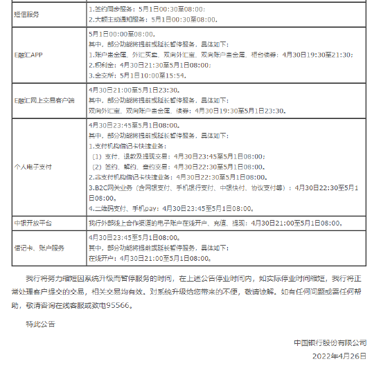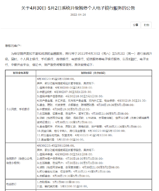 4月26日消息,中国银行公告,4月30日-5月2日,因系统升级,将暂停个人电子银行服务。