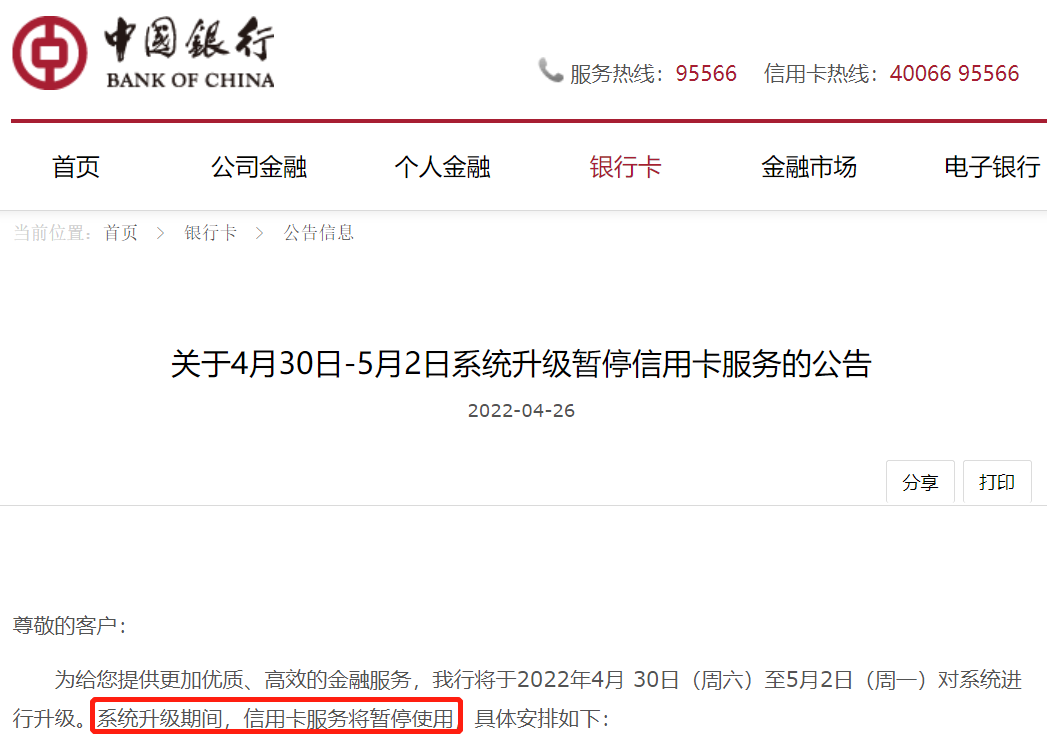 公告显示,为了提供更加优质、高效的金融服务,中国银行将于2022年4月 30日(周六)至5月2日(周一)对系统进行升级。系统升级期间,信用卡服务将暂停使用。