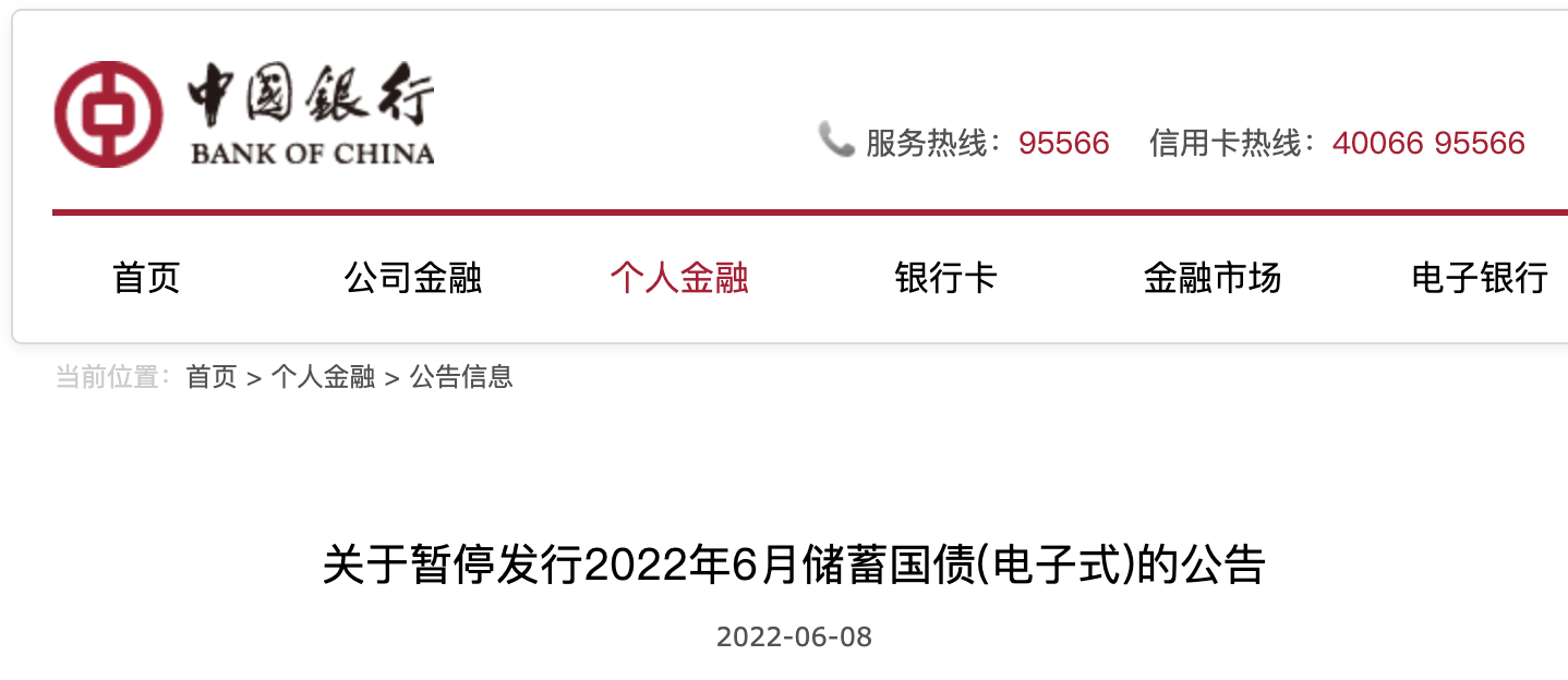 6月8日,中国银行发布关于暂停发行2022年6月储蓄国债(电子式)的公告。