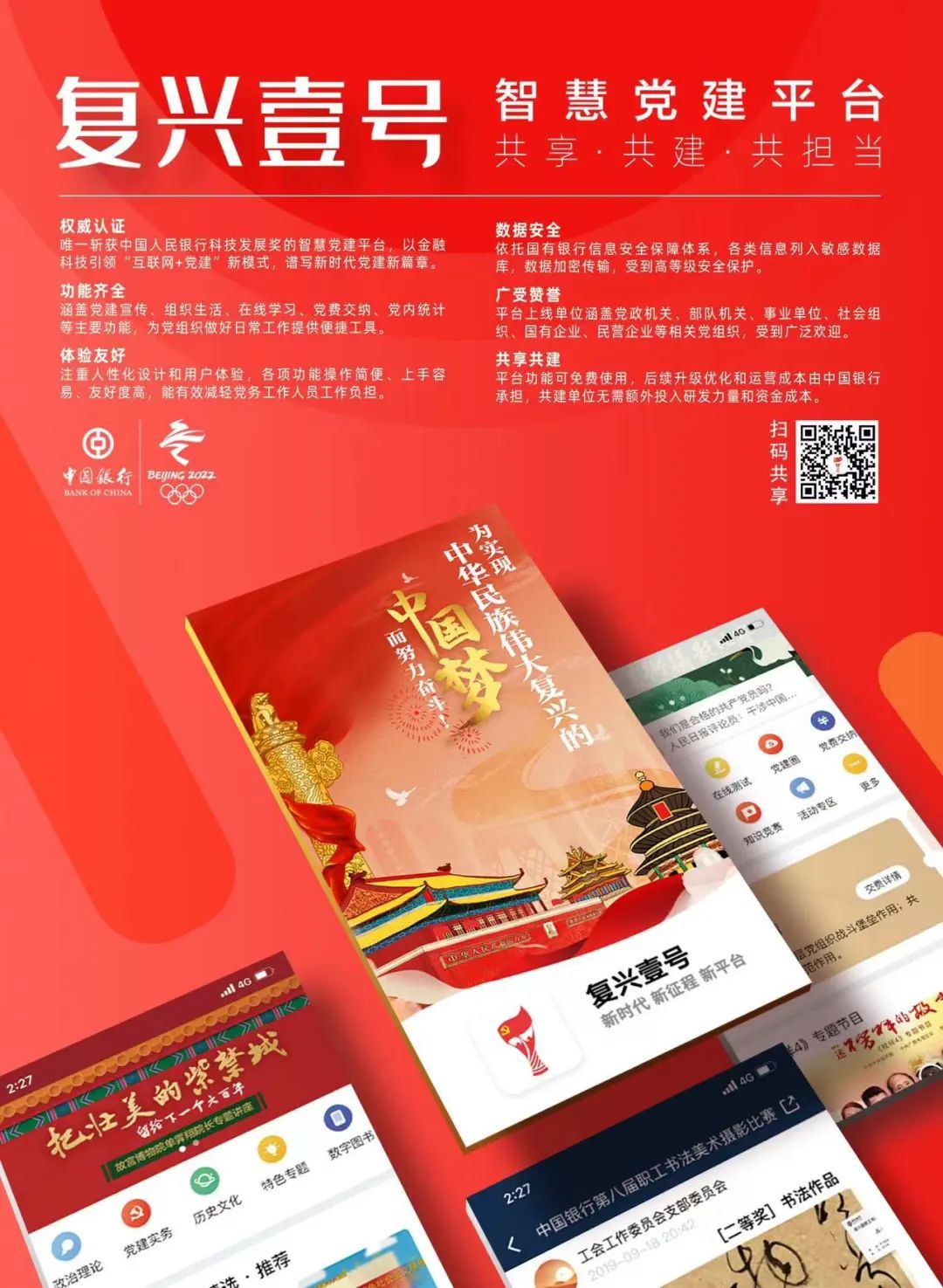 “复兴壹号”是中国银行党委认真贯彻落实党中央关于“运用互联网技术和信息化手段开展工作”的要求,顺应互联网、云计算、大数据为代表的信息技术快速发展趋势,秉承共享、共建、共担当理念,联合重点客户单位,共同打造的“互联网+党建”新模式。它由中国银行自主研发,于2017年7月1日上线。五年来,它的“朋友圈”日益扩大,截至目前已上线单位11800多家,注册用户人数约557万名,覆盖部队机关、党政机构、高等院校、医院、国有企业、民营企业单位党组织,持续赋能中行及广大共建单位基层党建工作。