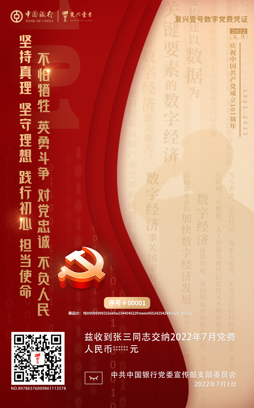 为庆祝中国共产党成立101周年,贯彻落实党中央关于积极运用互联网、大数据等新兴技术创新党组织活动内容方式的部署要求,近日,中国银行充分发挥“复兴壹号”智慧党建平台(以下简称“复兴壹号”)优势,依托科技手段,发放专属数字党费凭证,以科技赋能党建仪式感。
