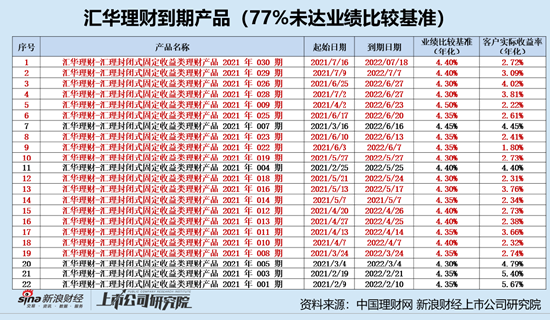 在这到期的22个产品中,仅有5个产品的客户实际收益率达到业绩比较基准,有17个产品未达标,业绩达标率仅为22.73%。在未达标的17个产品中,甚至有12个产品的实际收益率低出标准1.5个百分点,一款产品名称为“汇华理财-汇理封闭式固定收益类理财产品 2021 年 022 期”的理财产品,设定的以及比较标准为4.35%,而客户最终实际收益率仅为1.80%。