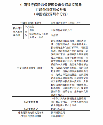 8月5日,银保监会官网披露的13张罚单显示,中国银行深圳市分行存在14项违法违规事实,被深圳银保监局罚款1130万元,12名相关责任人同时收到处罚。