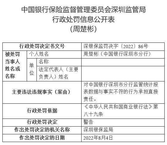 深银保监罚决字〔2022〕86号显示,周楚彬对中国银行深圳市分行监管统计报表数据与事实不符的行为承担直接责任。深圳银保监局依据《中华人民共和国银行业监督管理法》第八十九条,对周楚彬警告。