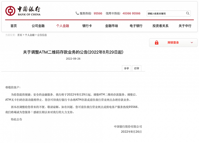 8月26日,中国银行公告,将于8月29日起,调整ATM二维码存款服务。调整后,ATM无卡扫码存款功能将停止,用户仍可持该行银行卡办理ATM存款或前往该行营业网点办理存款业务。