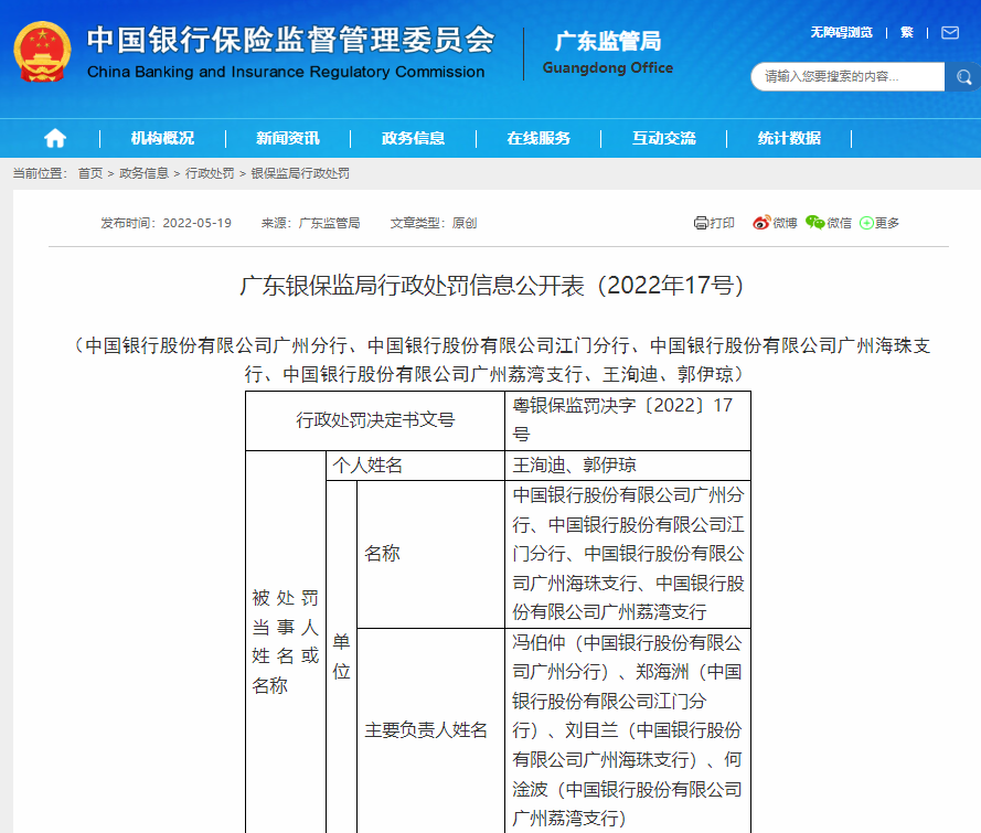 2022年5月份,中国银行广州海珠支行曾因向未取得施工许可证的房地产装修工程项目发放贷款、贷款业务严重违反审慎经营规则等原因被银保监会罚款110万元。